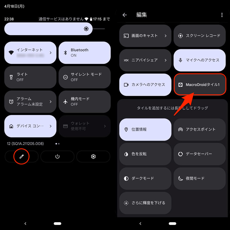 从笔图标打开编辑屏幕并添加 MacroDroid 磁贴。
