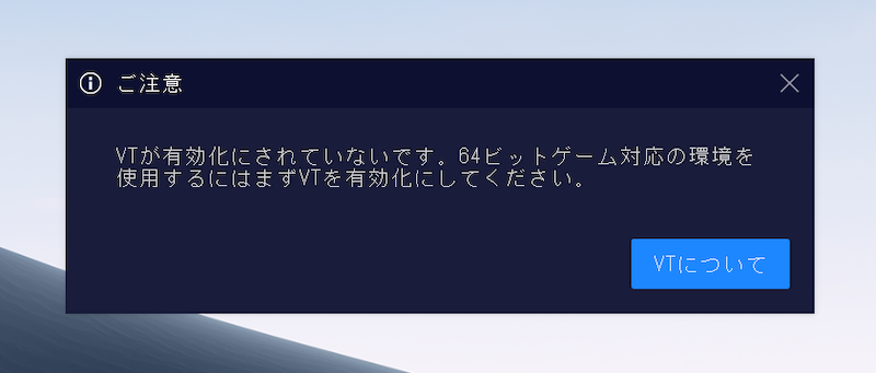 VTが有効化にされていないです。 64ビットゲーム対応の環境を使用するにはまずVTを有効化にしてください。