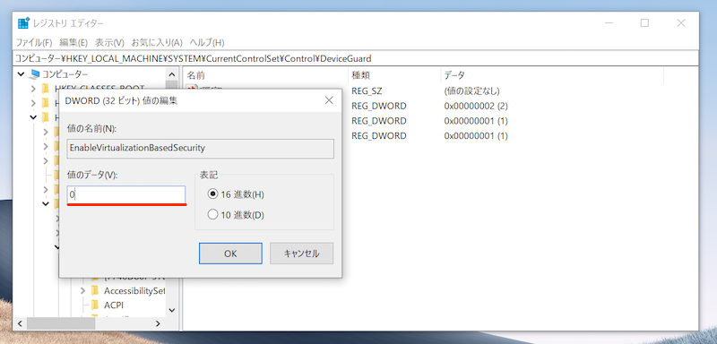启用基于虚拟化的安全性如果该值为 1(启用),请将其更改为 0(禁用)。