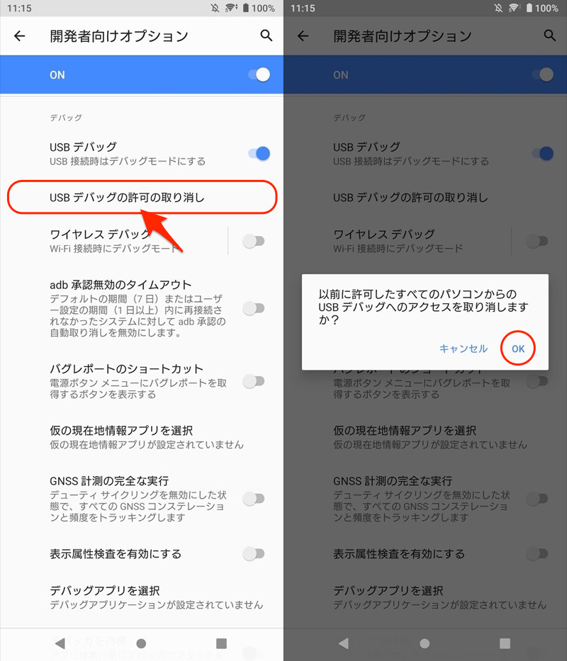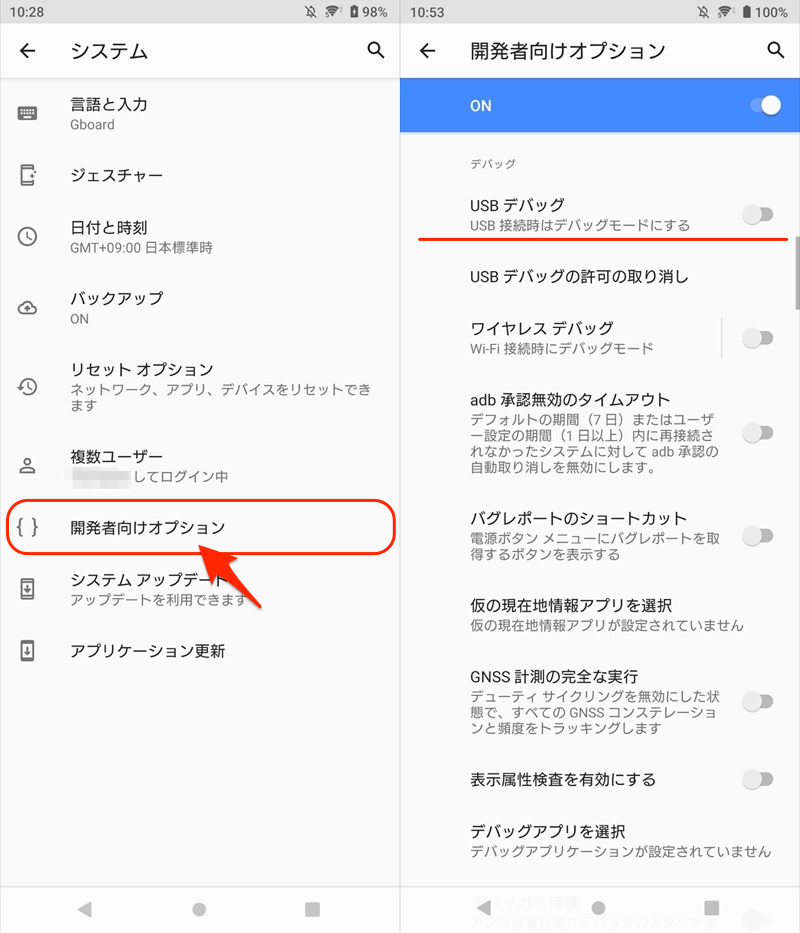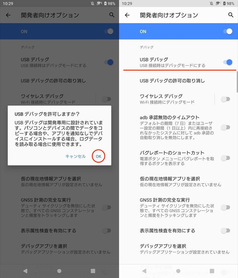 ご利用の端末のUSBデバッグがオンに設定されているため、本アプリはご利用いただけません。 USBデバッグをオフにした後に、アプリを起動してください。