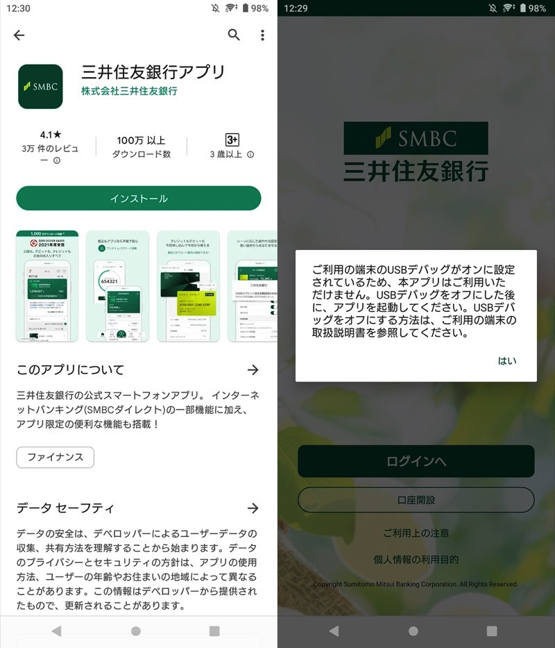 三井住友银行应用程序示例。除非关闭 USB 调试,否则无法使用。