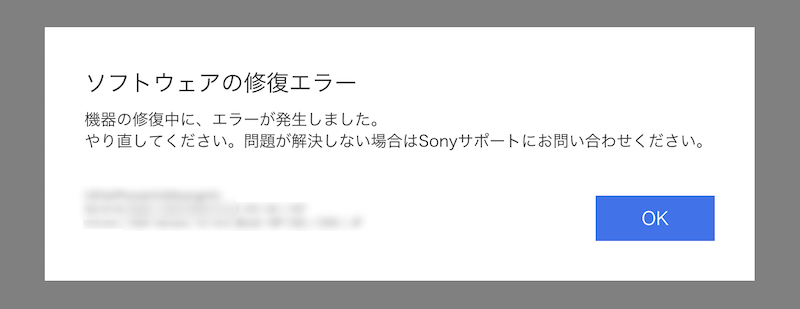 ソフトウェアの修復エラー 機器の修復中に、エラーが発生しました。 やり直してください。問題が解決しない場合はSonyサポートにお問い合わせください。