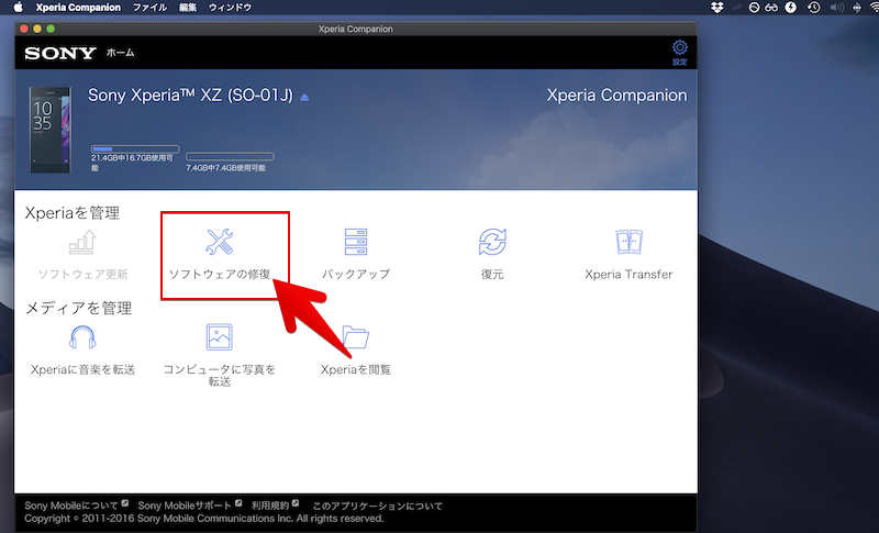 关于“软件修复”更详细的说明,请参考相关文章【如何使用 Xperia Companion!连接到您的 PC 并传输文件] 进行了解释。