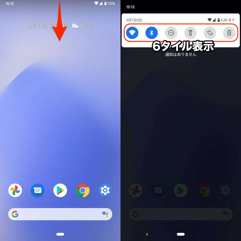 Pixel 3a XL 的示例。前六个图块也位于通知抽屉的顶部。