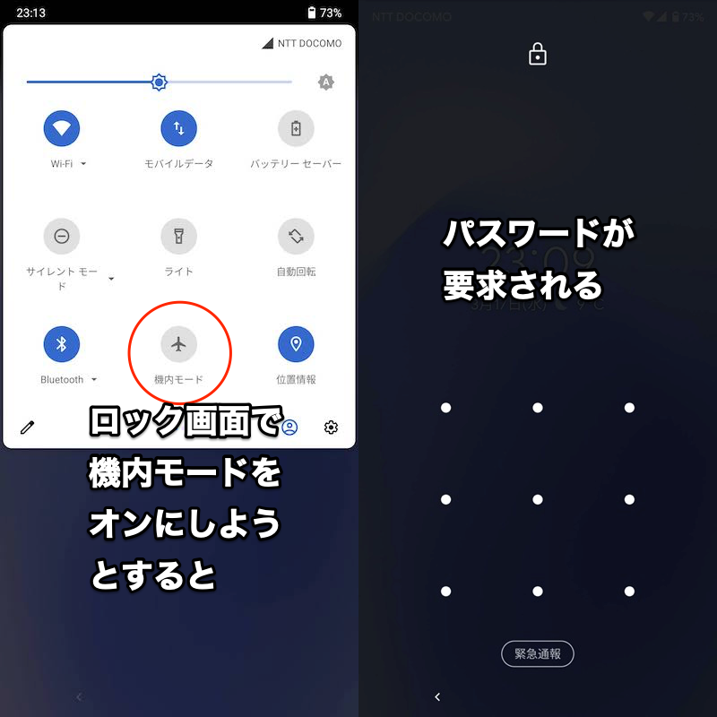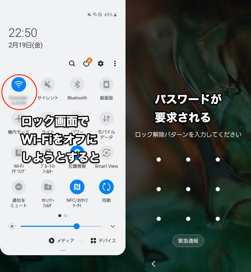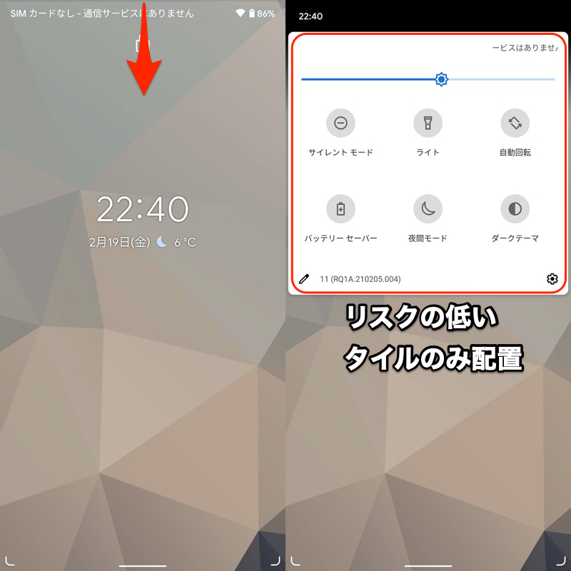 即使在锁定屏幕上,如果从状态栏(左)滑动,也会出现快速设置面板(右)。