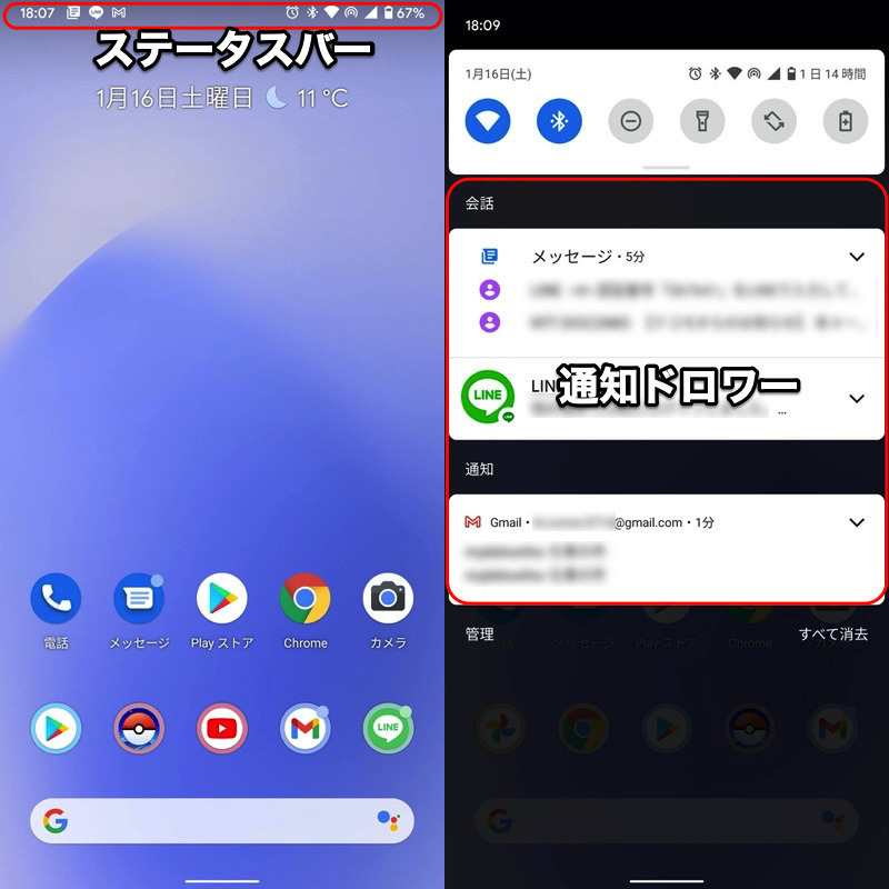(左)状态栏 (右)通知抽屉