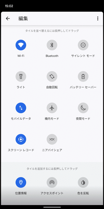 Pixel 3a XL 的示例。您可以使用“长按并拖动以添加图块”将其移动到上方区域来添加图块。