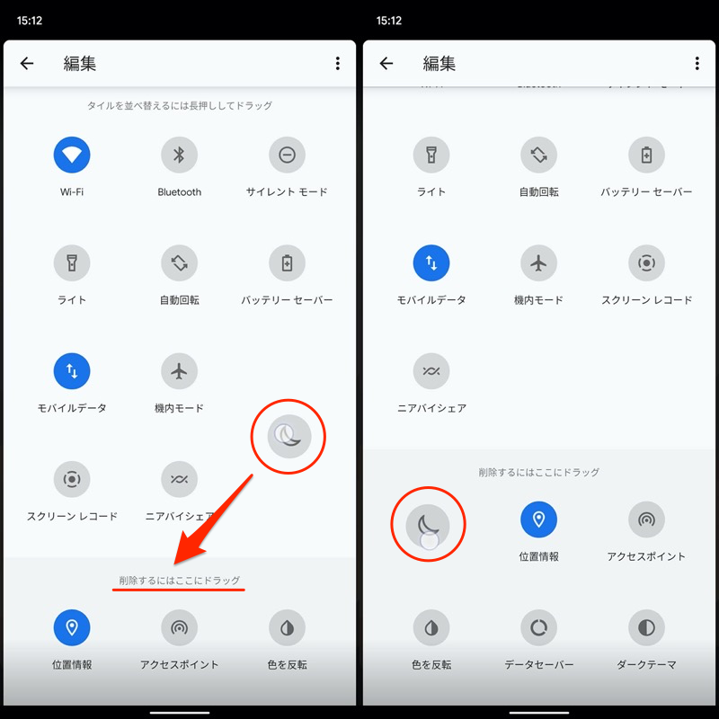 将要删除的图块拖放到屏幕底部,它将在快速设置面板中隐藏。