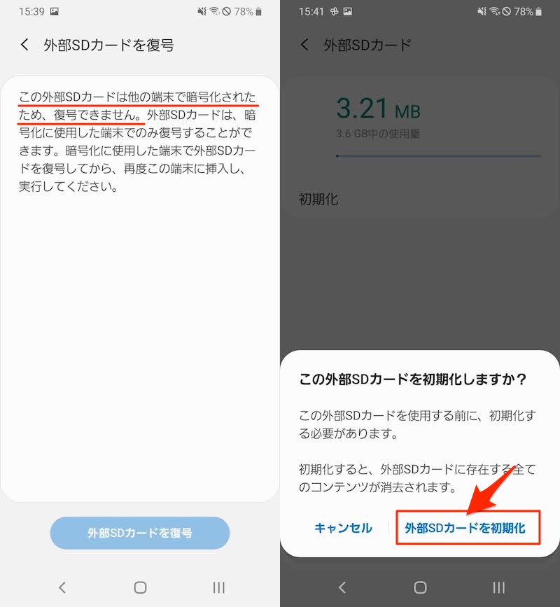(左)将加密的 SD 卡插入其他设备时出现的消息(右)您可以通过初始化 SD 卡来使用它。