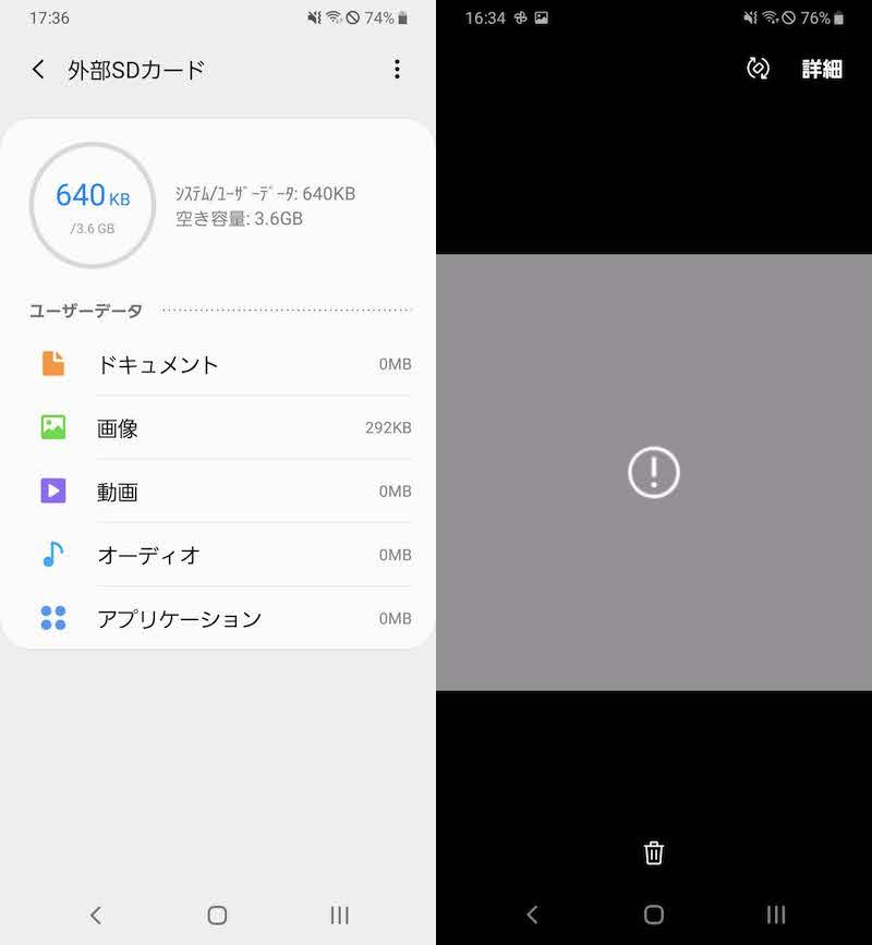 将加密的 SD 卡插入另一台设备的示例。它识别 SD 的存在(左),但无法读取其内容(右)。