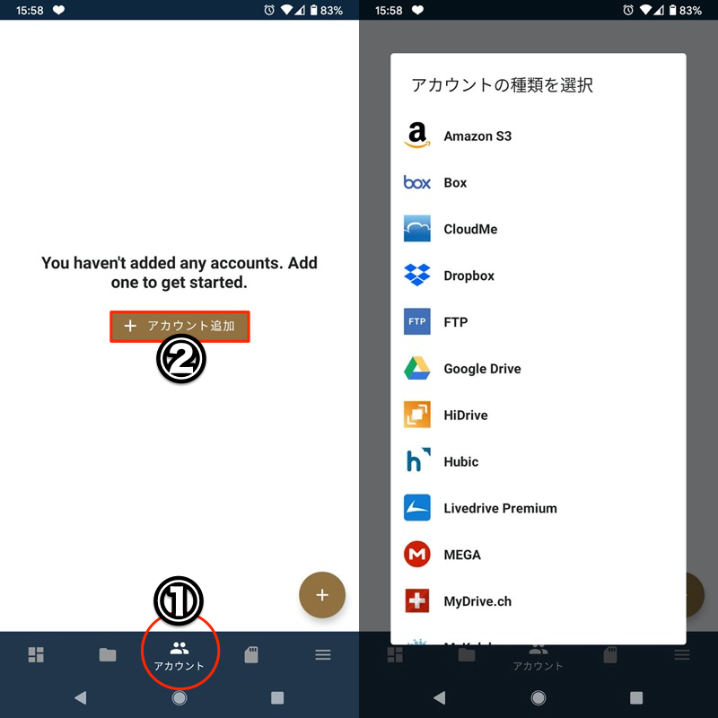 从“帐户”选项卡添加帐户并选择您想要的在线存储服务。