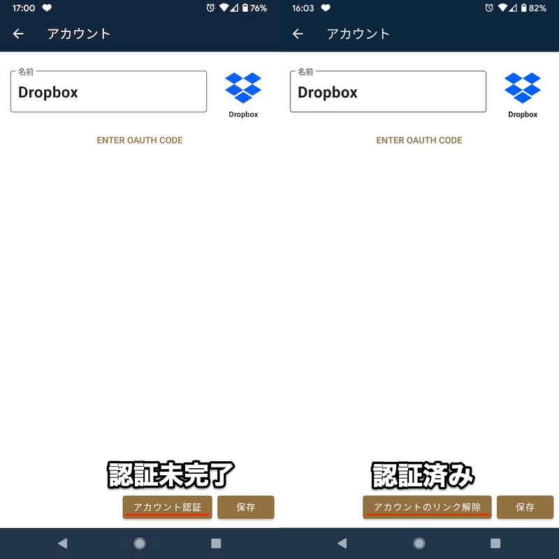 (左)按钮表示账户验证状态(=认证未完成) (右)按钮表示账户解除关联状态(=认证完成)