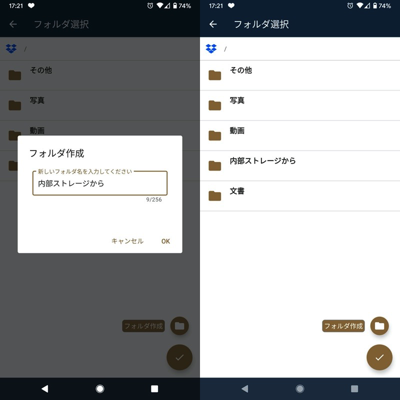 示例中,目标文件夹是 Dropbox 中的“来自内部存储”。