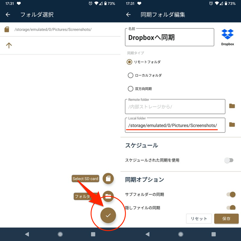 将内部存储“屏幕截图”同步到 Dropbox 的示例。该文件已直接移至 Dropbox。