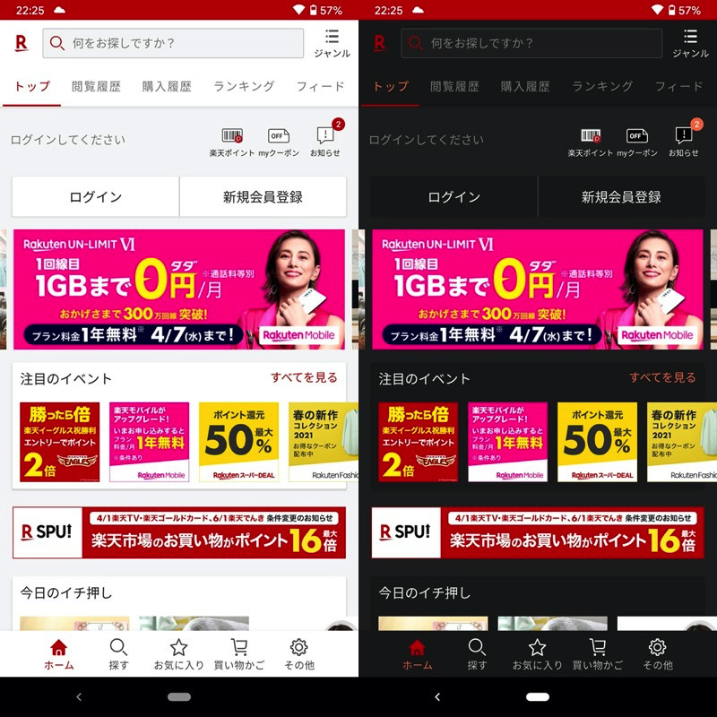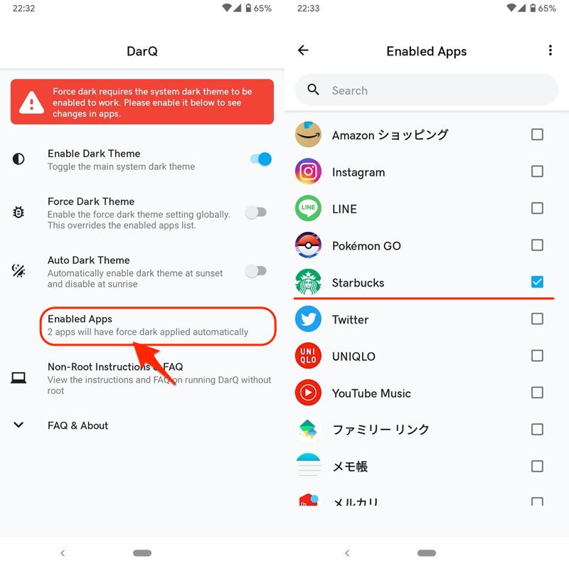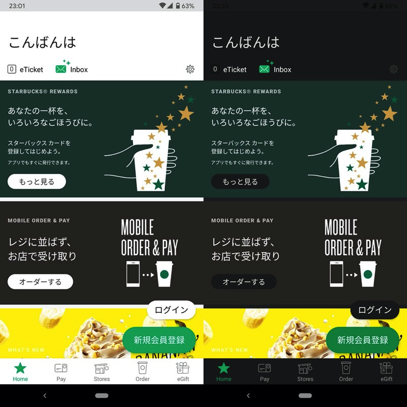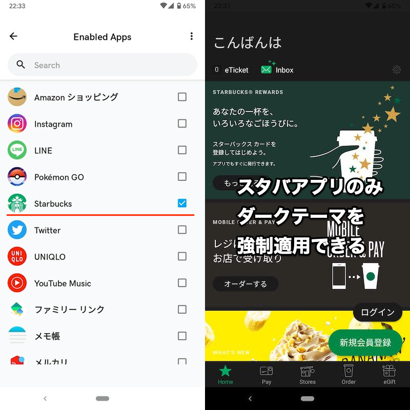 检查星巴克应用程序的示例(左)。强制应用深色主题(右)。