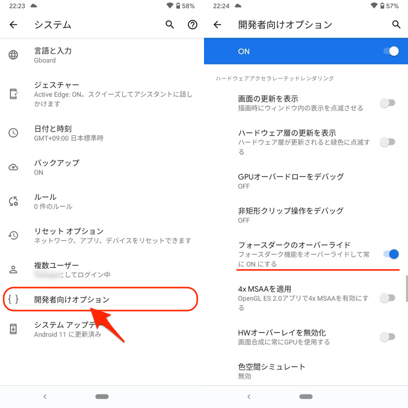 点击这里如果启用了“强制黑暗覆盖”,请将其重新关闭。开发者选项强制黑暗覆盖详细内容已在上一部分中解释(