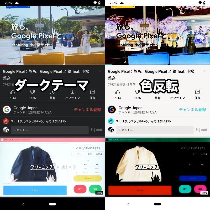 YouTube 屏幕示例。颜色反转(右)也会反转视频本身的黑白。