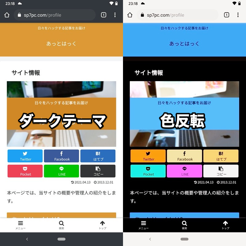 来自我们网站的示例。与正常的深色主题(左)相比,测试功能将效果扩展到网站内容(右)。