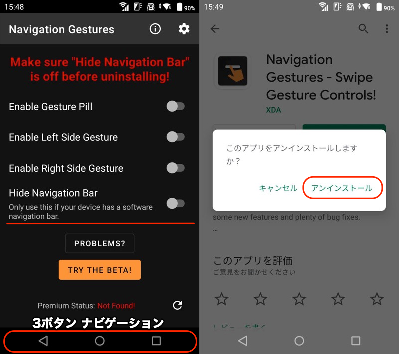 卸载导航手势时,请务必隐藏导航栏请在运行之前禁用它并恢复导航栏。