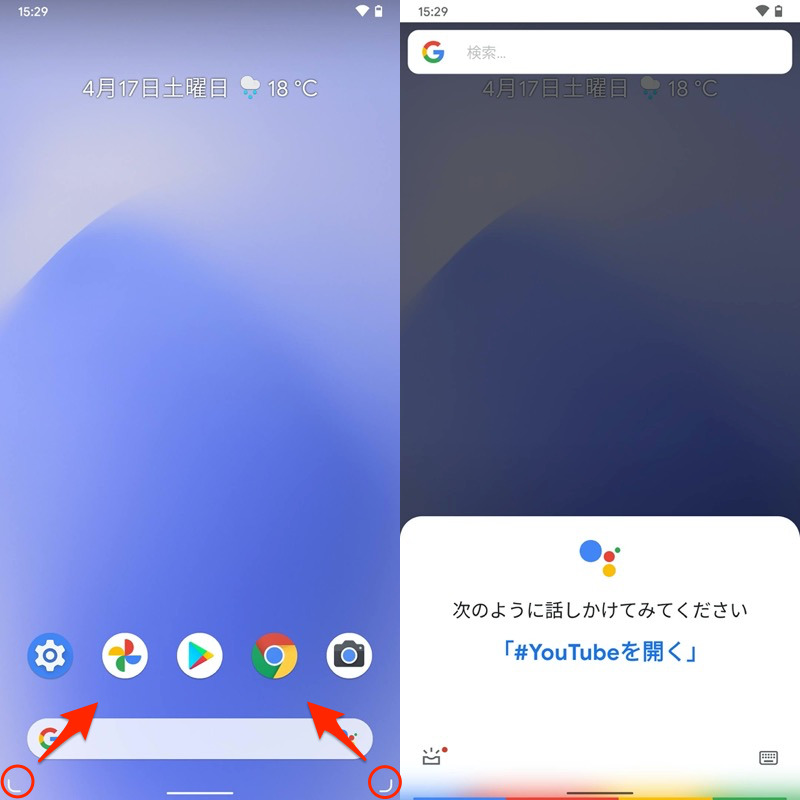 从引导线(左)滑动以启动 Google Assistant(右)。