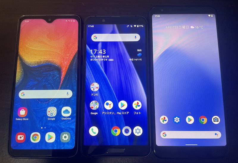 左起:Galaxy A20、AQUOS sense3、Pixel 3a XL。