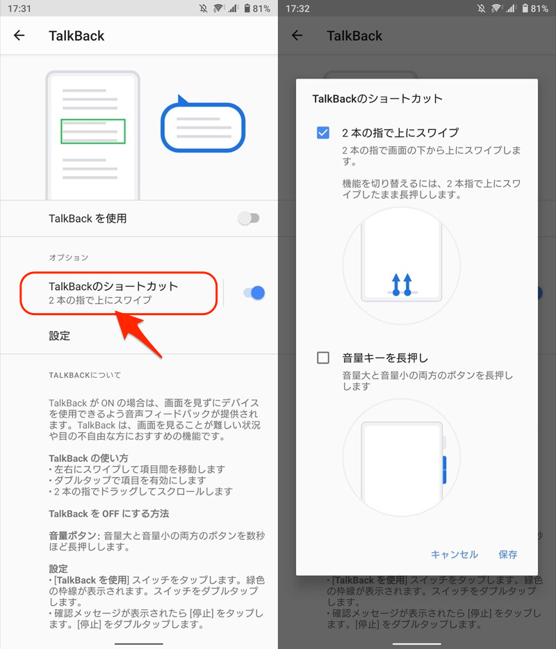 TalkBack 快捷方式“用两根手指向上滑动”的示例。