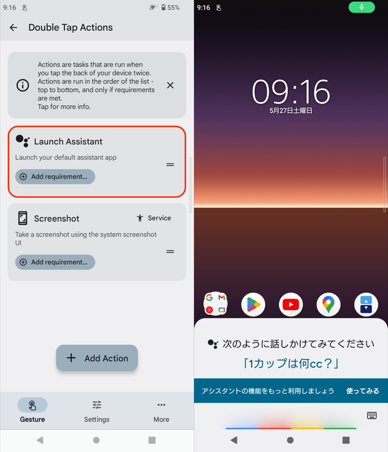 默认设置的 Google Assistant 示例,通过轻按背面即可激活。
