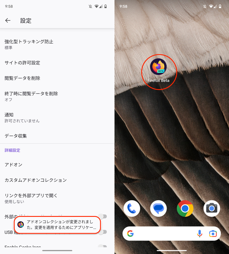 アドオンコレクションが変更されました。 変更を適用するためにアプリケーション...