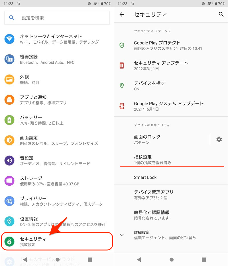 以 Xperia 10 II 为例。您可以从“安全”→“指纹设置”进行注册。