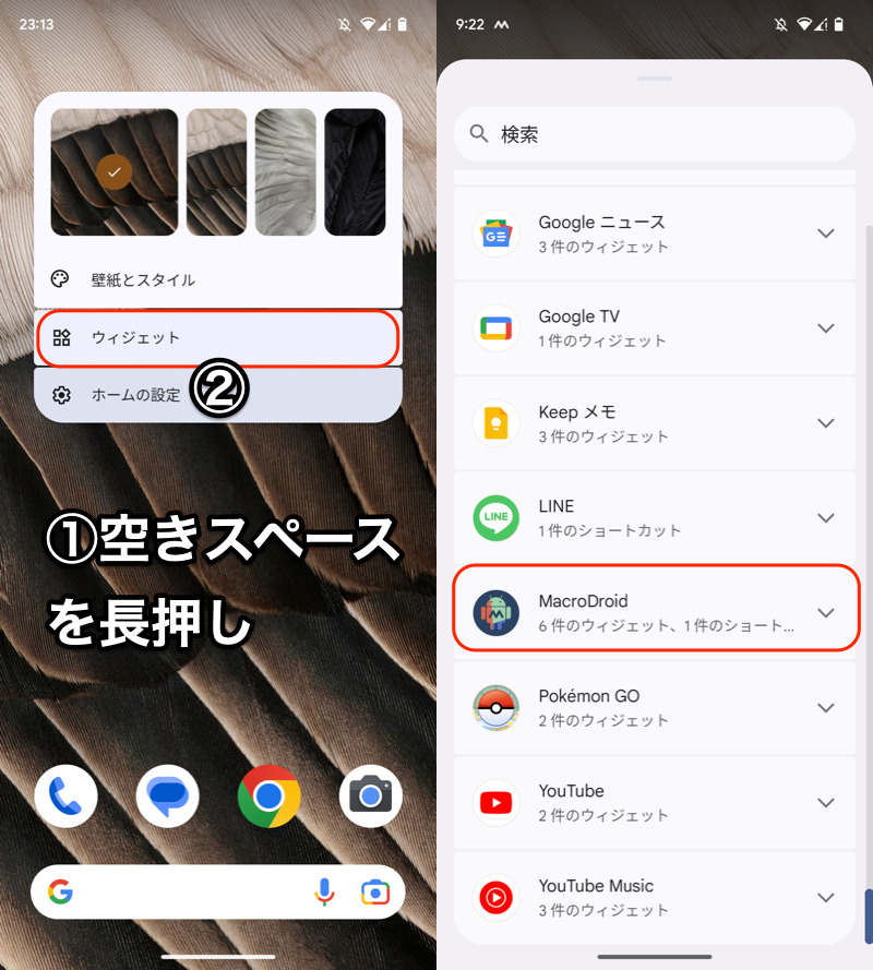 长按主屏幕上的空白区域小部件从那里选择 MacroDroid。