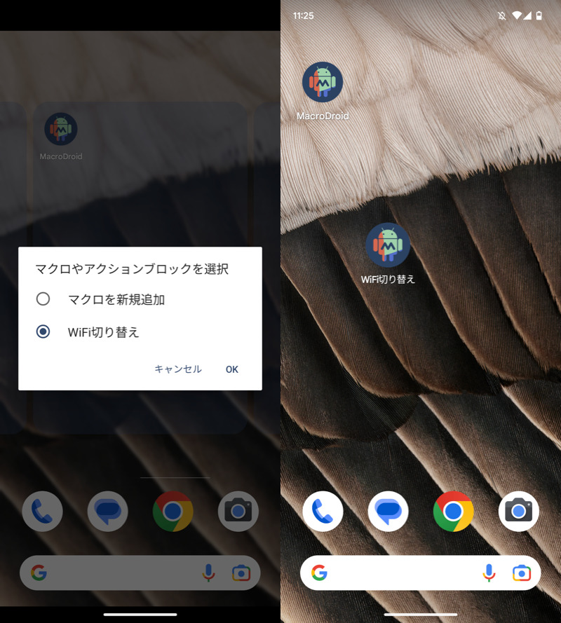 通过拖放将“MacroDroid 快捷方式”添加到主屏幕,然后在下一个屏幕上选择您创建的宏“WiFi 切换”。