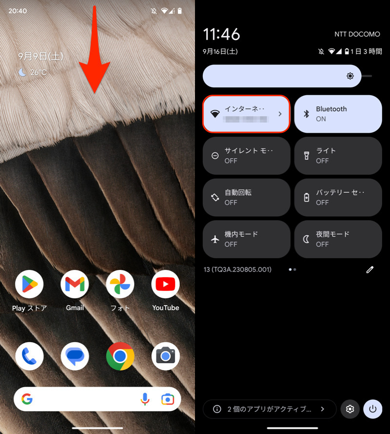 (左)从上到下滑动(右)点击 Wi-Fi 磁贴