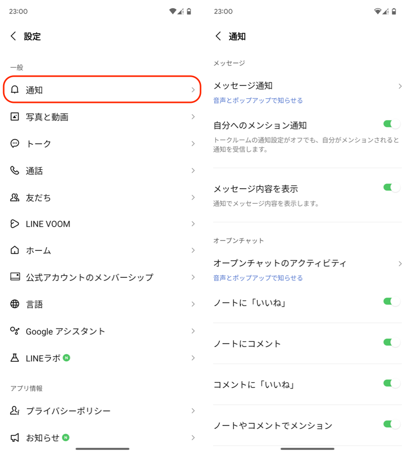 (左)LINE 应用程序设置 → 通知(右)显示通知类型