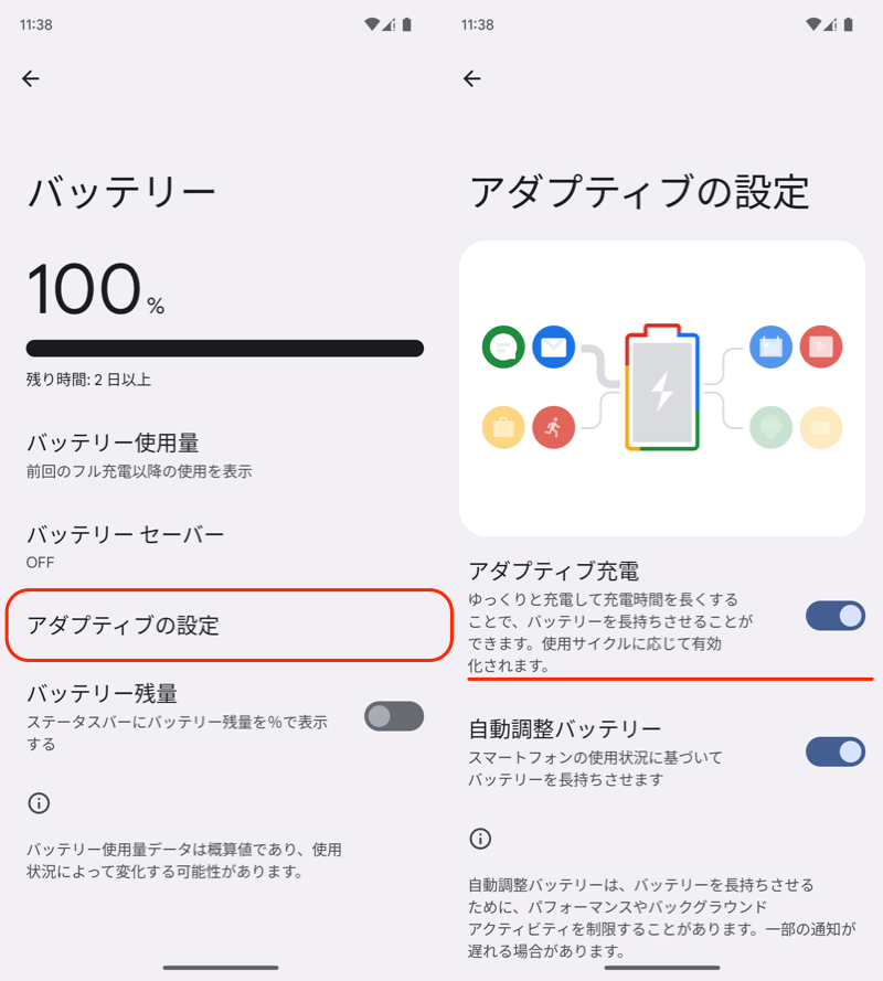 以 Pixel 系列为例,自适应充电断开电源前 1 小时电池将充电至 100%。