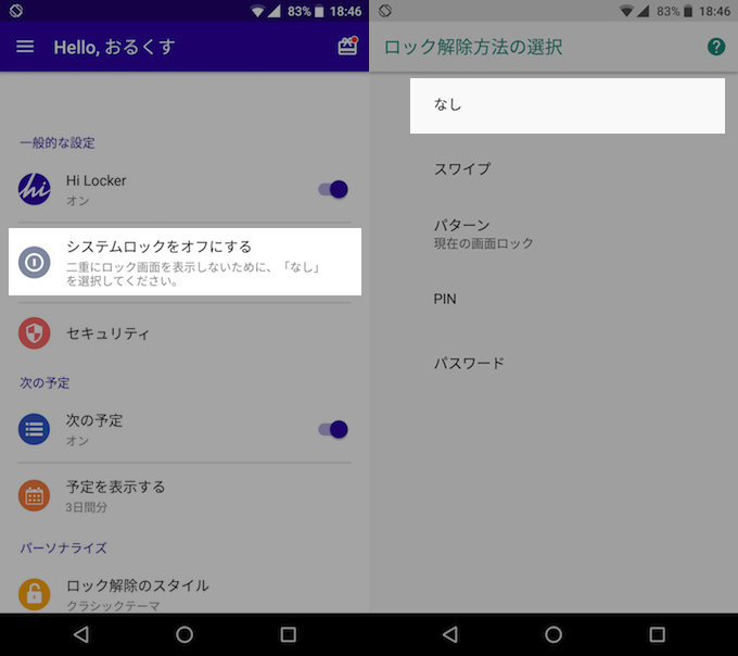 (左)应用应用程序自己的锁定设置和(右)关闭 Android 标准锁定设置。