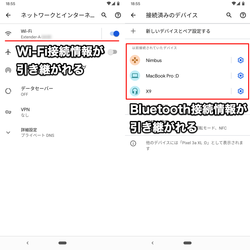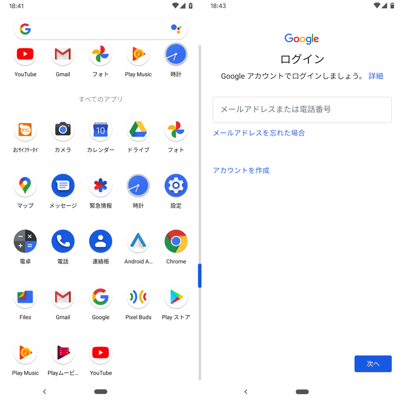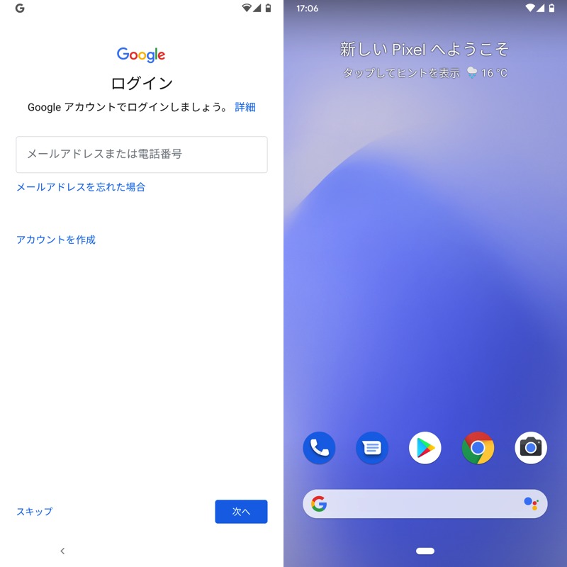 (左)Google 帐户等的初始设置。(右)设置完成后的第一个屏幕