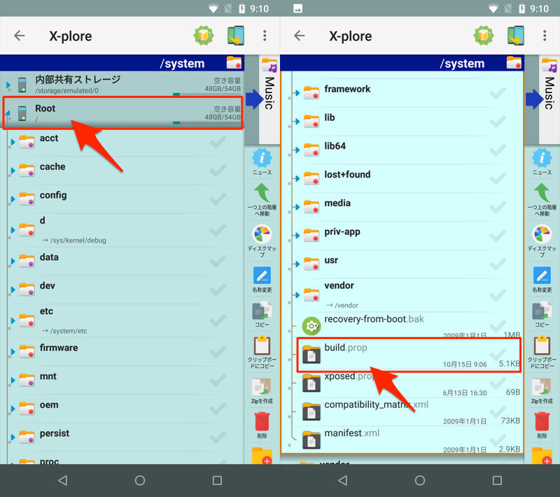 使用X-plore文件管理器打开根区域顶部以下位置的系统文件。构建.prop选择,