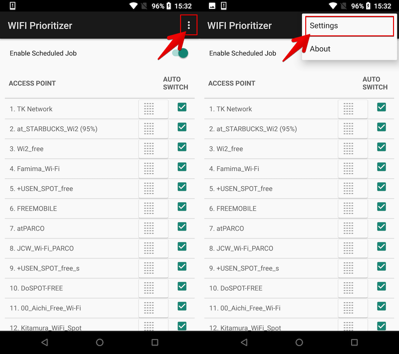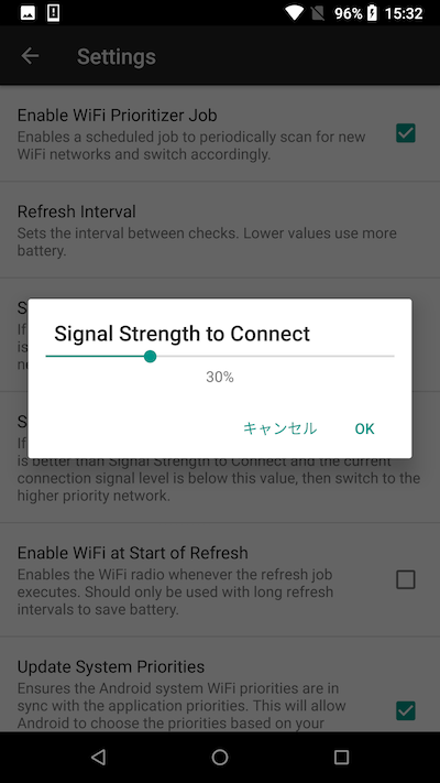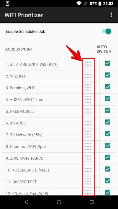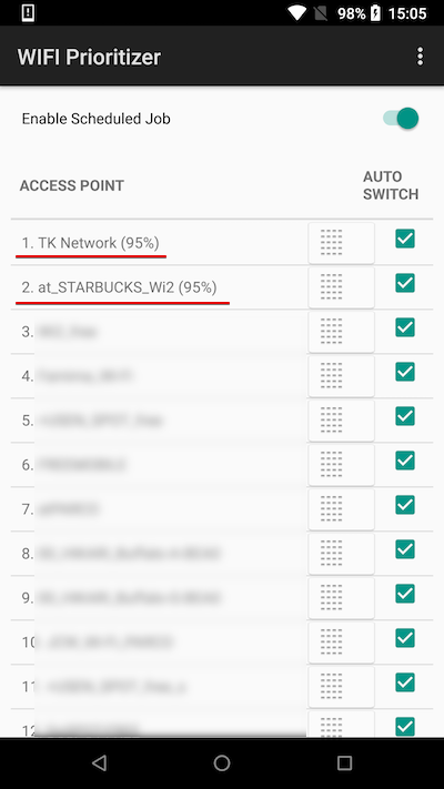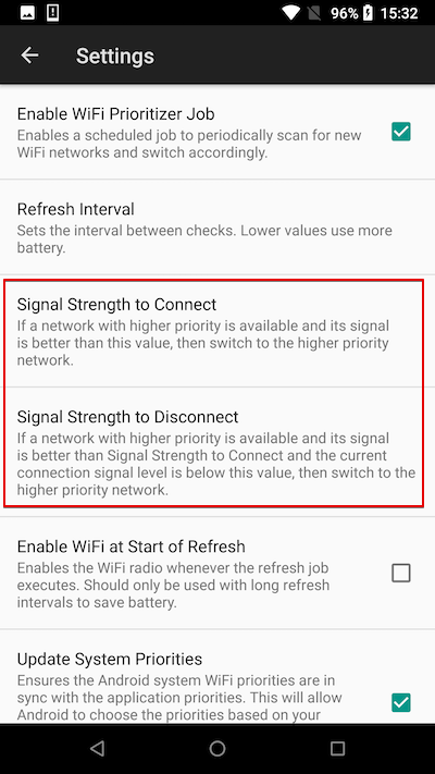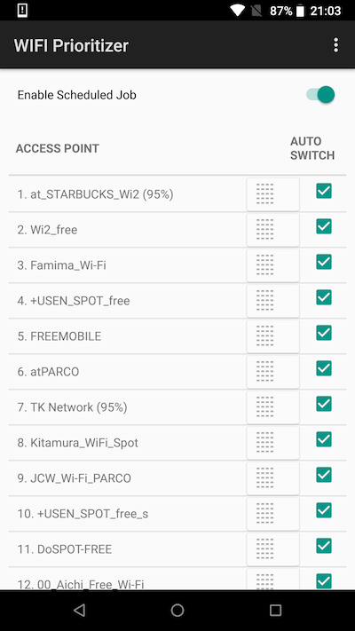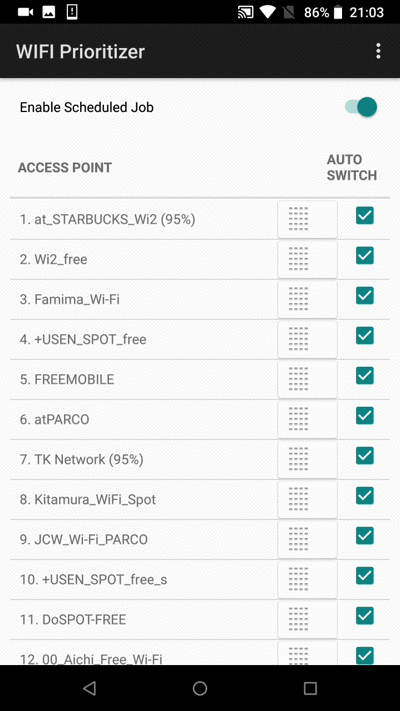 除了此处设置的“优先级”外,“WiFi Prioritizer”应用程序还有多个因素决定自动切换目的地(详细内容将在下面的“自动切换阈值”中进行说明)。