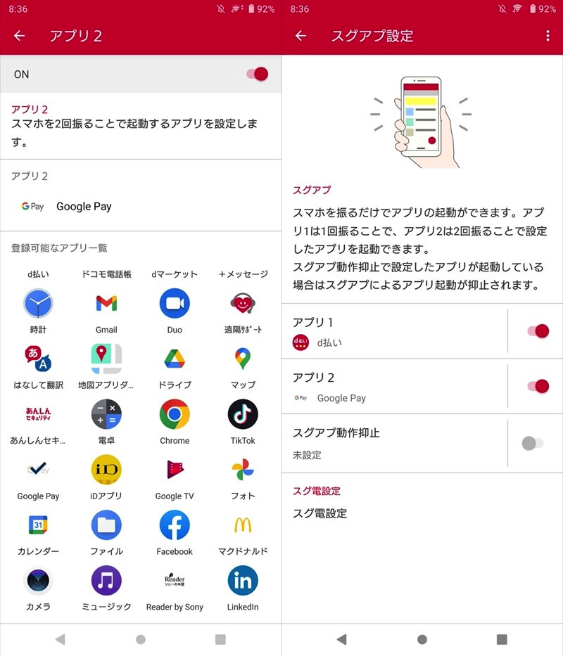 (左)可设置的应用程序列表(右)将 Google Pay 分配给“摇动两次”的示例