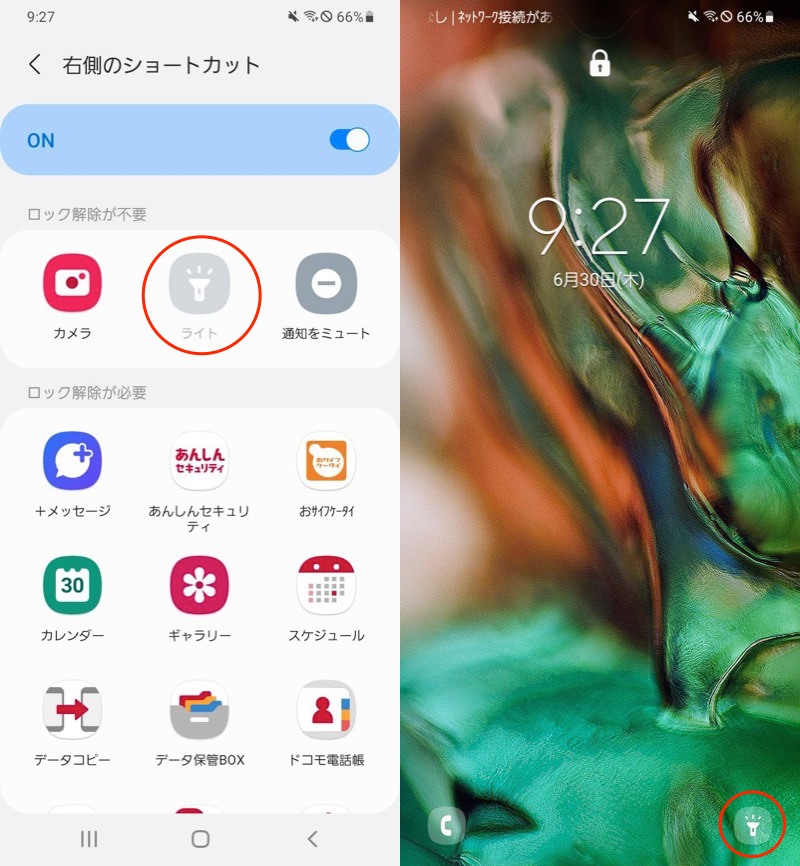 将锁屏右侧的快捷方式替换为灯光的示例。