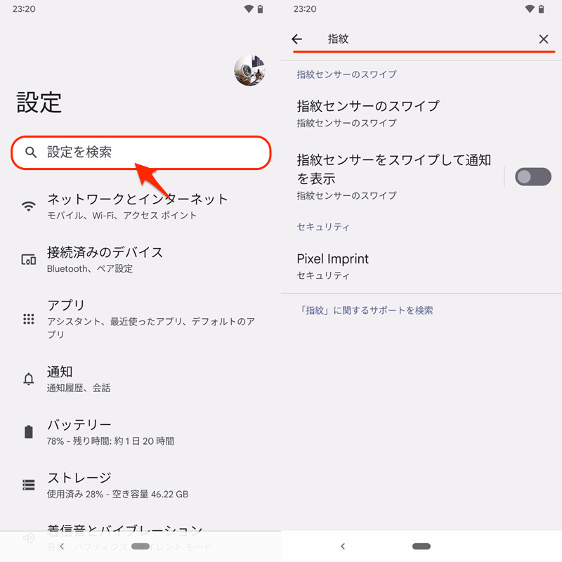 Pixel 3a XL 的设置屏幕示例。搜索“指纹”,您会找到一个菜单。