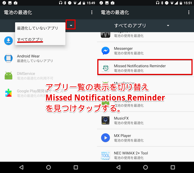 转换后的屏幕上会显示尚未应用“电池优化”的应用程序列表,因此切换到“所有应用程序”列表并找到“错过的通知提醒”。