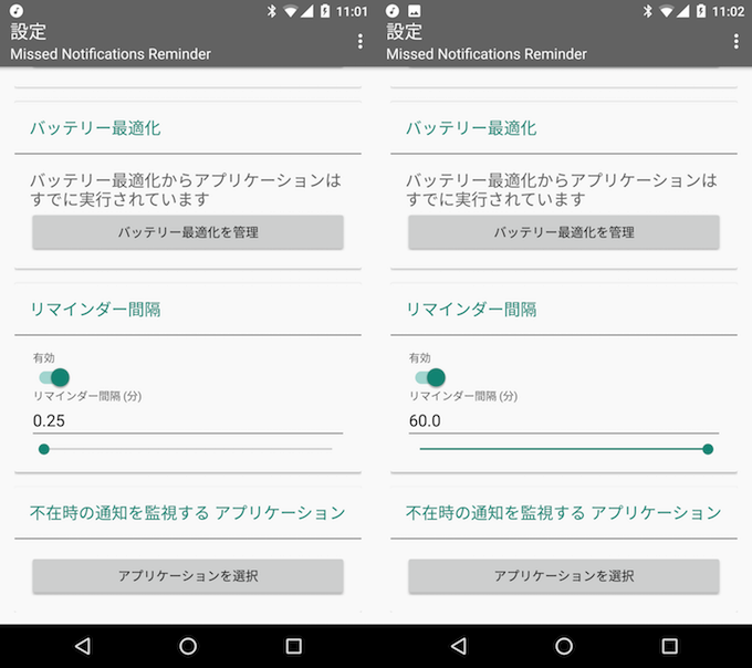 接下来,调整错过的应用程序的通知之间的间隔。可以从最短 0.25 分钟(=15 秒)到最长 60 分钟(=1 小时)进行调整。