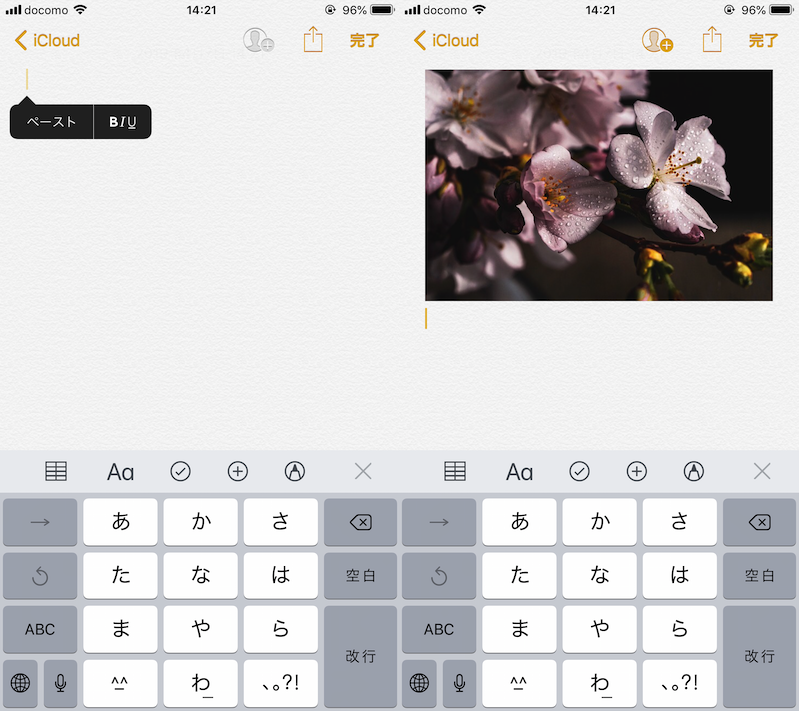 粘贴使用 iOS 标准“备忘录”应用程序复制的照片的示例。