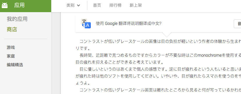 例如,对于“单色”应用程序,可以使用“英语”描述,但不支持“中文”,因此整个 Google Play 商店都是中文的,但描述却以原始日语显示。