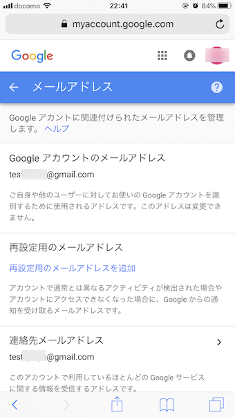 当您转到“电子邮件地址”项时,您将看到当前注册的 Gmail 地址以及用于重置的子电子邮件地址。