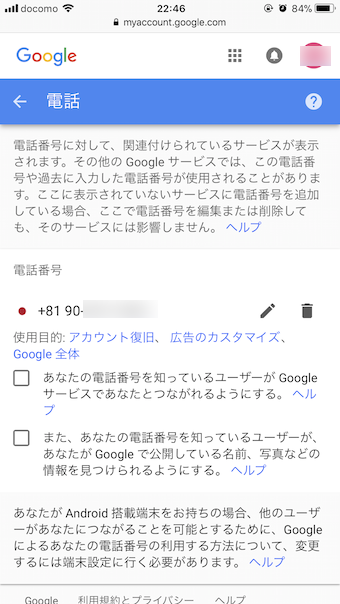 如果您转到“电话号码”项目,您可以检查注册的号码,使用“笔”图标更新它,或使用“垃圾桶”图标删除它。