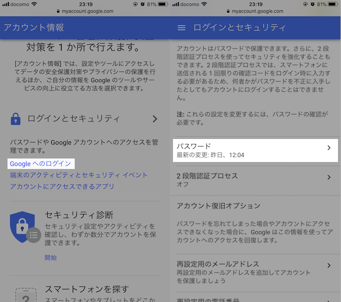 接下来,打开“登录和安全”下的“登录 Google”,然后转到“密码”。