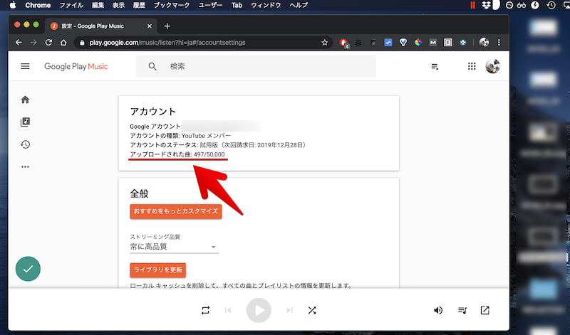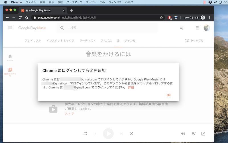 別のアカウントを使ってGoogle Playで購入した楽曲ファイルをアップロードするには、 購入時に使用したアカウントにログインする必要があります。