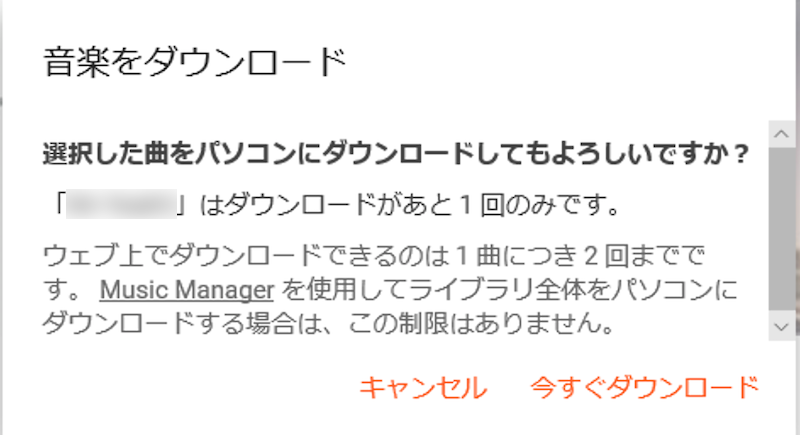 選択した曲をパソコンにダウンロードしてもよろしいですか? 「●●(曲名)」はダウンロードがあと1回のみです。 ウェブ上でダウンロードできるのは1曲につき2回までです。 Music Managerを使用してライブラリ全体をパソコンにダウンロードする場合は、この制限はありません。
